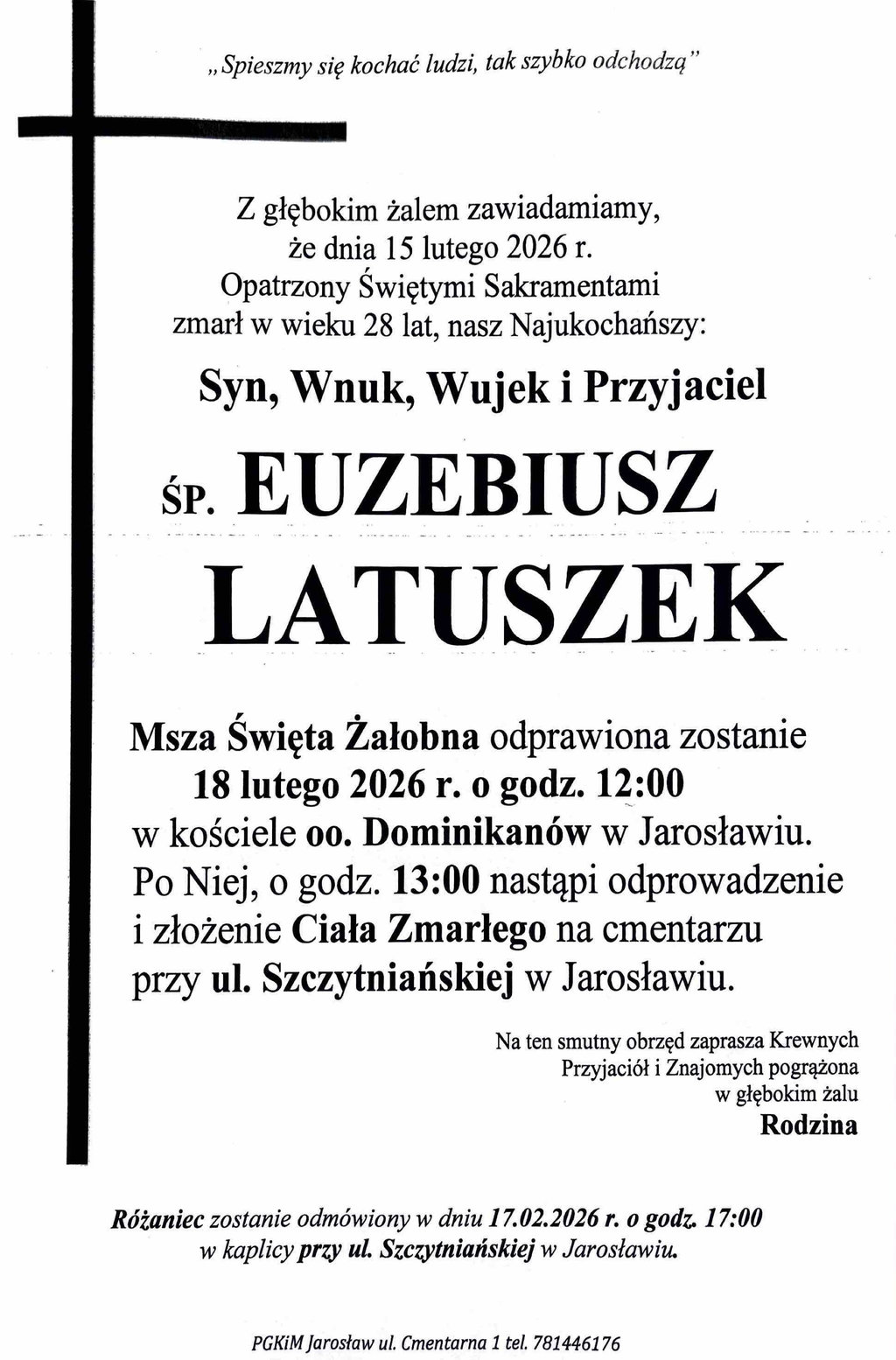 Msza Święta Żałobna odbędzie się 18 lutego 2026 r. o godz. 12:00 w kościele oo. Dominikanów w Jarosław. Po Mszy, o godz. 13:00, nastąpi odprowadzenie i złożenie Ciała Zmarłego na cmentarzu przy ul. Szczytniańskiej w Jarosław.Łączymy się w bólu z Panią Kasią, Jej Rodziną i Bliskimi, składając w imieniu całej Społeczności PSONI najszczersze wyrazy współczucia.Miłość jest największym darem, jaki możemy dać. Gdy przyjdzie czas odejścia, nie umiera – trwa w sercach na zawsze.