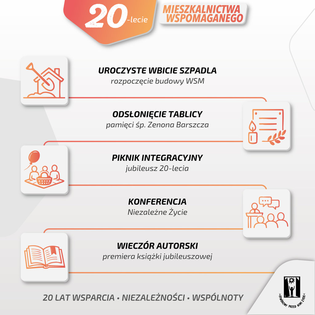 Jubileusz 20-lecia będzie wyjątkowy również dlatego, że właśnie w tym roku rozpocznie się budowa Wspomaganych Społeczności Mieszkaniowych — kolejnego kroku w stronę nowoczesnego, kompleksowego systemu wsparcia. Inwestycję zainauguruje symboliczne wbicie szpadla, które stanie się znakiem kontynuacji misji rozpoczętej dwie dekady temu.